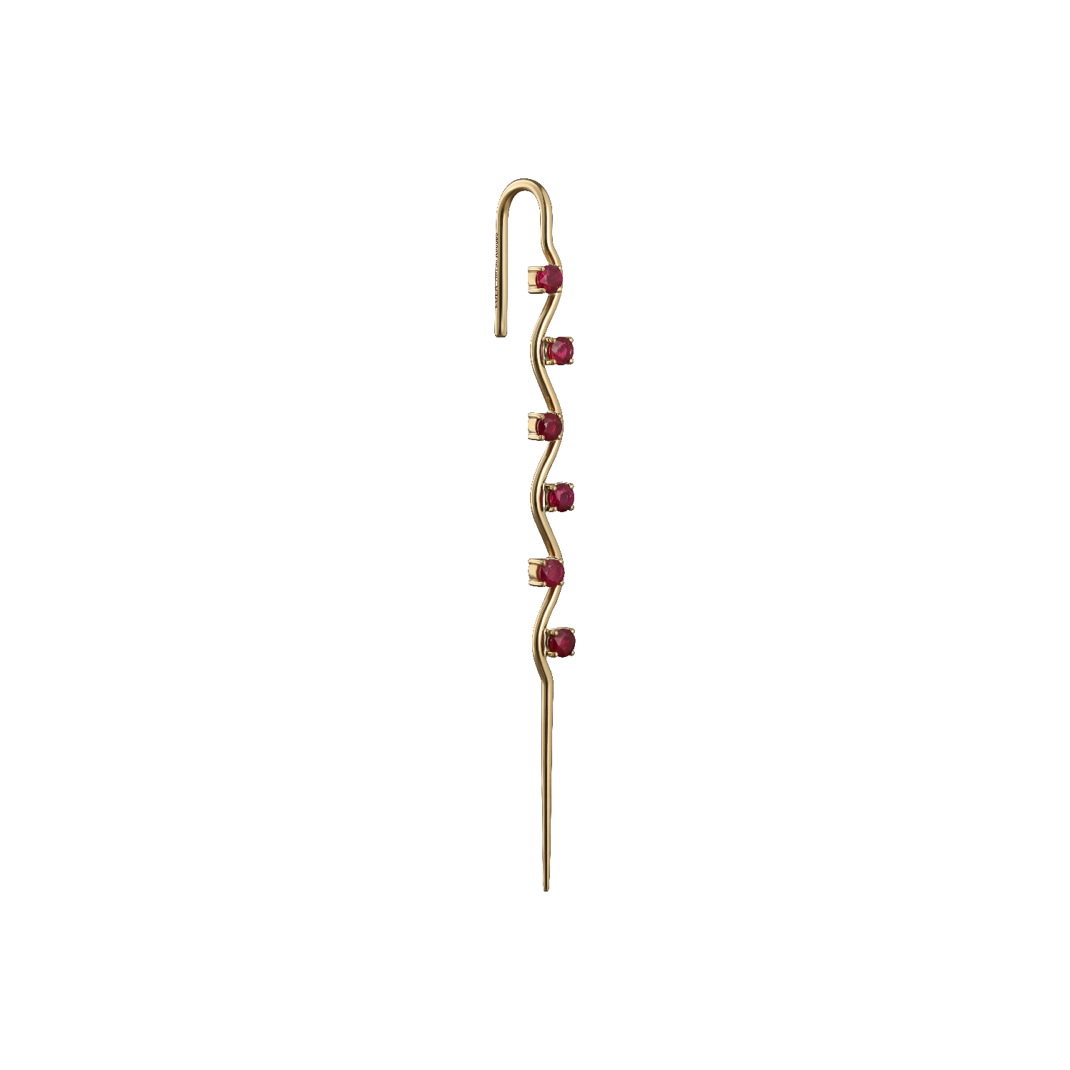 Enchanting allure of the Foré ear pin, crafted in 18k yellow gold. Its graceful, wavy silhouette evokes the natural beauty of a tree in motion, while six juicy rubies shimmer along the curves, adding a touch of passion. A captivating blend of nature and elegance—designed to turn heads.